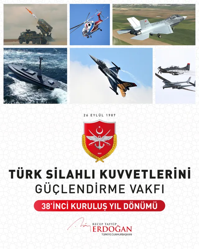 Cumhurbaşkanı Recep Tayyip Erdoğan, sosyal medya hesabından yaptığı paylaşımla Türk Silahlı Kuvvetlerini Güçlendirme Vakfı'nın (TSKGV) 38'inci kuruluş yıl dönümünü kutladı.
