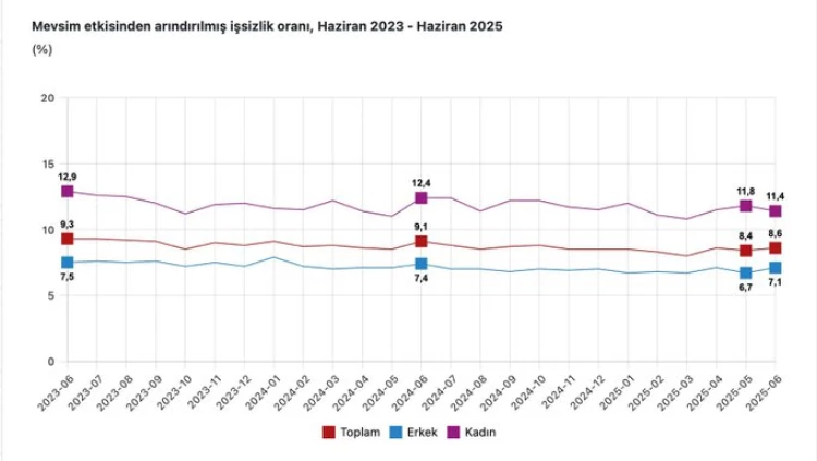 Mevsim etkisinden arındırılmış işsizlik oranının bir önceki aya göre 0,2 puan artarak yüzde 8,6'ya yükseldiğini belirten Yılmaz, bu oranın geçen yıla kıyasla 0,5 puan azaldığını ve son 26 aydır tek haneli seviyelerde istikrarlı bir seyir izlediğini ifade etti.