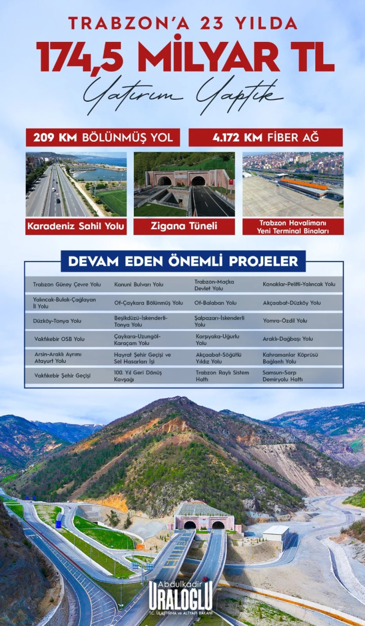 Avrupa'nın en uzun çift tüplü karayolu tüneli Zigana'yı hayata geçirdiklerini belirten Bakan Uraloğlu, Karadeniz Sahil Yolu'ndaki ilerleme oranının AK Parti hükümeti iktidara geldiğinde yüzde 25-30 civarında olduğunu belirtti. Akyazı Tüneli'nin tek başına yapılmış olan en önemli yatırımlardan bir tanesi olduğunu belirten Bakan Uraloğlu, Beşikdüzü-İskenderli-Tonya yolu, Akyazı Stadyumu'na ve hastaneye hizmet edecek olan modern dönel kavşağı bitirerek hizmete açtıklarını anımsattı.