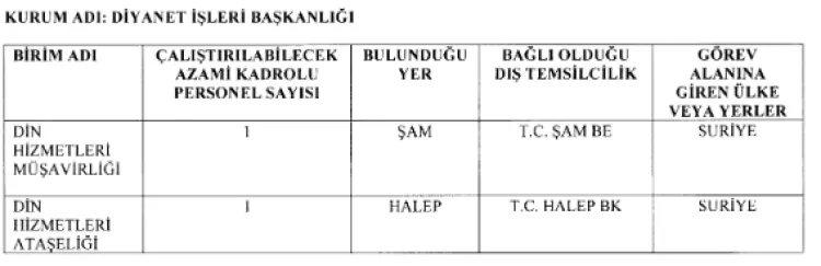 Buna göre, Diyanet İşleri Başkanlığı'na bağlı olarak Suriye'nin Halep kentinde olan Din Hizmetleri Ataşeliği ile Şam'da bulunan Din Hizmetleri Müşavirliği oluşturuldu.