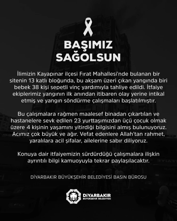 Diyarbakır'ın Kayapınar ilçesinde bir sitenin 13 katlı bloğunda çıkan yangında anne ve üç çocuğu hayatını kaybetti. Diyarbakır Büyükşehir Belediyesi, 38 kişinin kurtarıldığını, itfaiyenin çalışmalara devam ettiğini bildirirken, Adalet Bakanı Yılmaz Tunç, olayla ilgili adli soruşturmanın titizlikle yürütüldüğünü duyurdu.