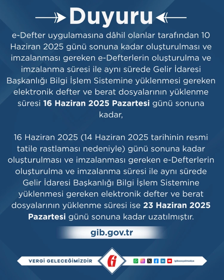16 Haziran 2025 (14 Haziran'ın resmi tatil olması nedeniyle) sonuna kadar oluşturulması ve imzalanması gereken e-Defterler ve berat dosyalarının yüklenme süresi ise 23 Haziran 2025 Pazartesi gününe kadar uzatıldı.