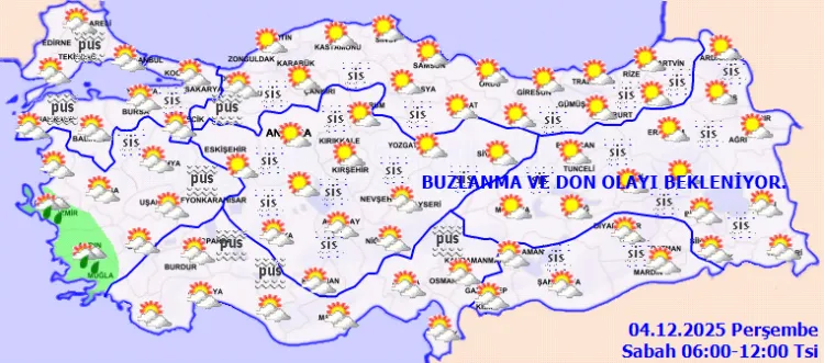 Gece ve sabah saatlerinde Marmara ile iç ve doğu bölgelerde pus ve yer yer sis görülecek. İç Anadolu'nun kuzeydoğusu ile Doğu Anadolu'nun kuzey ve doğusunda ise buzlanma ve don olayı bekleniyor.