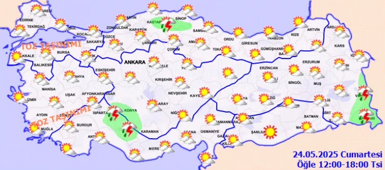 Meteoroloji, Konya, Kastamonu, Hakkari ve Van'da yerel sağanak yağış, Ege ve Marmara'da toz taşınımı uyarısı beklendiğini açıkladı. Hava sıcaklıkları mevsim normalleri üzerinde seyredecek. Rüzgar genelde güneyli, doğuda ise kuzeyli esecek.