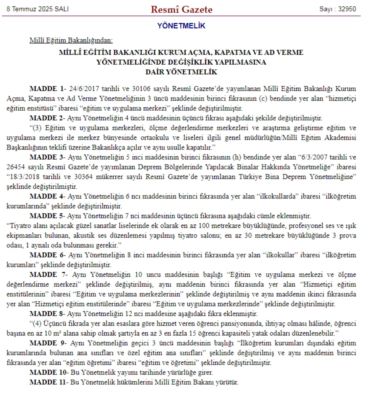 Değişiklikler, 8 Temmuz 2025 itibariyle yürürlüğe girerken, hükümleri Milli Eğitim Bakanı yürütülecek.