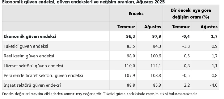 Ekonomik güven endeksi Temmuz ayında 96,3 iken, Ağustos ayında yüzde 1,7 oranında artarak 97,9 değerini aldı. İnşaat sektörü güven endeski bir önceki aya göre yüzde 4 oranında azalarak endeks değeri 88,8'den 85,3'e geriledi.