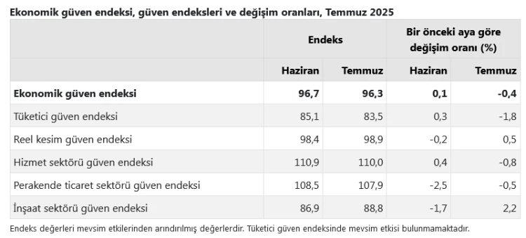 Türkiye'de ekonomik güven endeksi, Haziran ayındaki 96,7'den Temmuz'da yüzde 0,4 azalarak 96,3'e düştü. Sektörel güven endekslerinde ise karışık bir tablo ortaya çıktı.