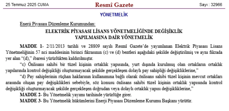 Enerji Piyasası Düzenleme Kurumu (EPDK), Elektrik Piyasası Lisans Yönetmeliği'nde değişiklik yaptı. Önlisans sahibi tüzel kişilerin ortaklık yapısındaki dolaylı pay değişikliklerine ilişkin yeni düzenlemeler, bugünkü Resmi Gazete'de yayımlandı.
