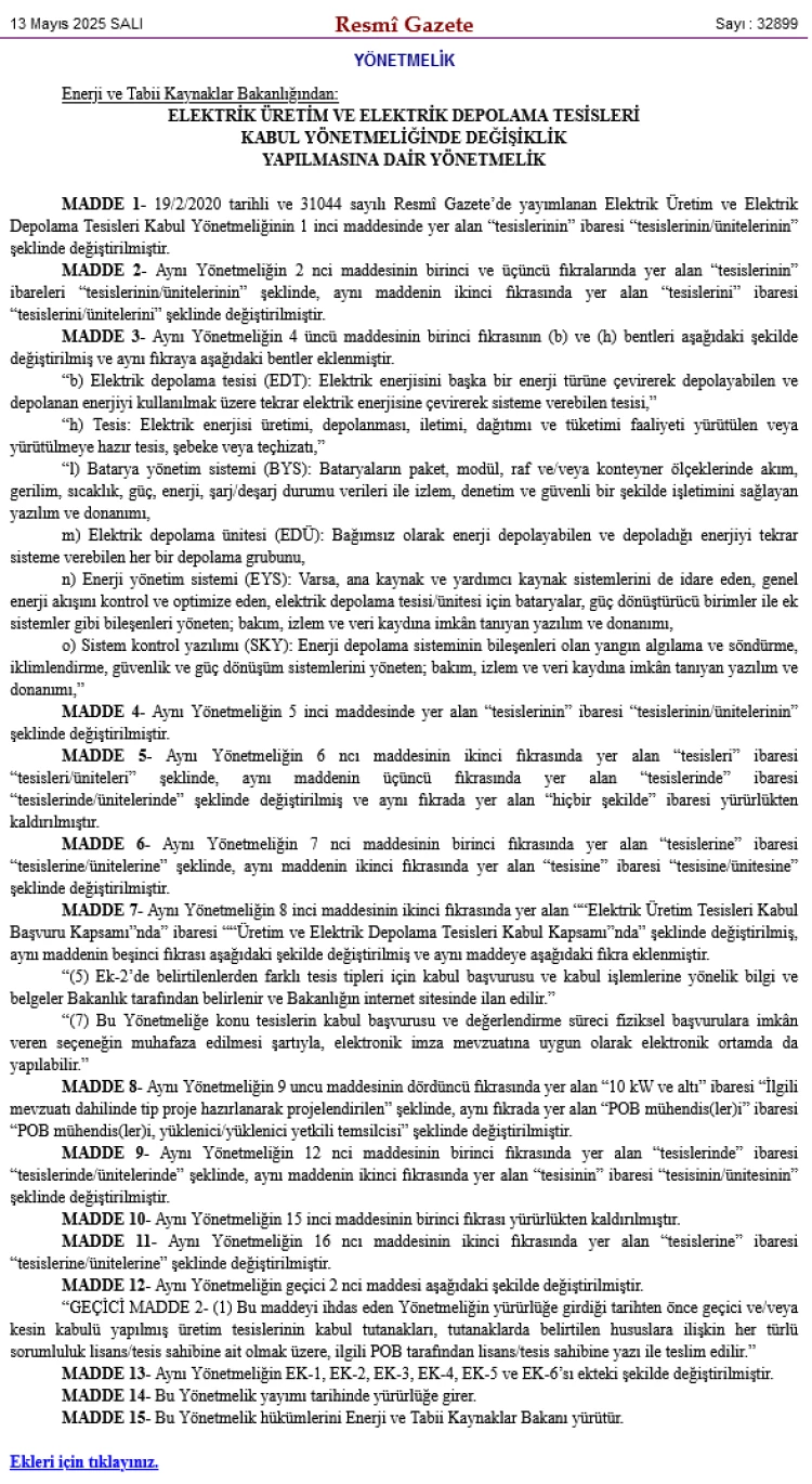 Bugünkü Resmi Gazete'de yayımlanan yeni yönetmelikle, "tesis" ibareleri "tesis/ünite" şeklinde genişletildi. Elektrik depolama tesisi ve ünitesi tanımları güncellendi, batarya yönetim sistemi (BYS), enerji yönetim sistemi (EYS) ve sistem kontrol yazılımı (SKY) gibi yeni kavramlar eklendi.