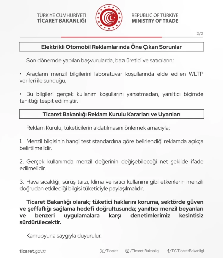 Reklam Kurulu, yanıltıcı reklamlara karşı kararlı adımlar attı. Ticaret Bakanlığı'ndan elektrikli otomobil reklamlarındaki menzil aldatmacalarına rekor cezalar ve erişim engeli geldi.