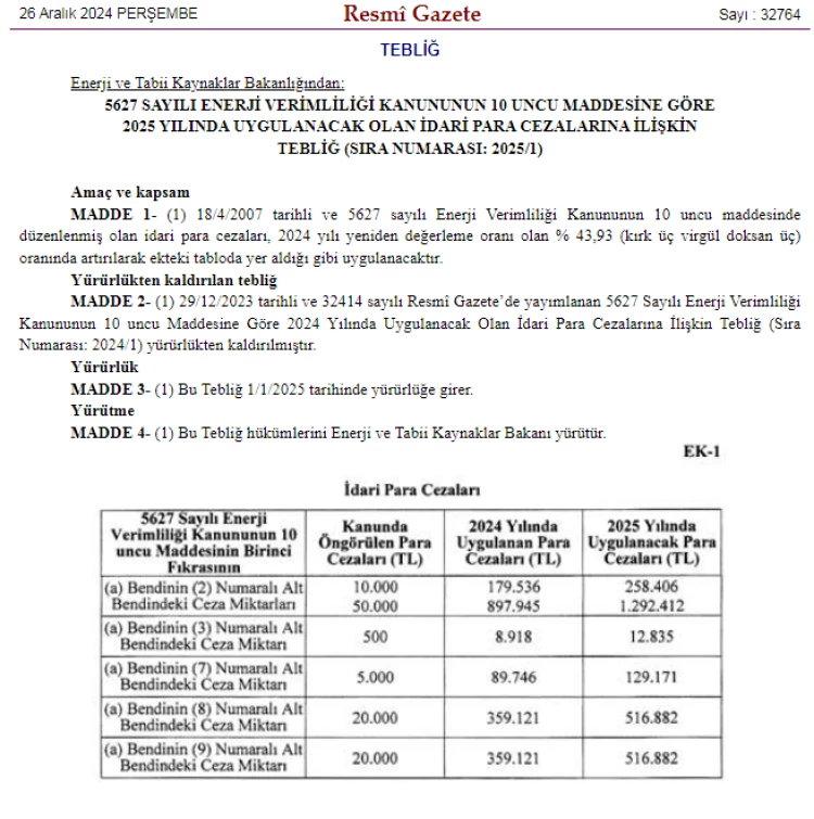 ANKARA (İGFA) - Enerji ve Tabii Kaynaklar Bakanlığı, Enerji Verimliliği Kanunu kapsamında uygulanacak idari para cezalarını 1 Ocak 2025 tarihinden geçerli olacak şekilde yüzde 43,93 oranında arttırdı.