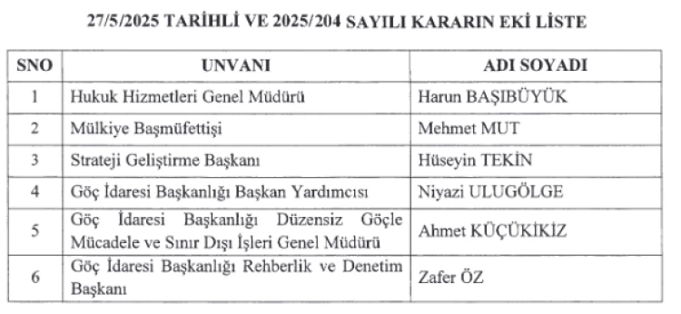 İçişleri Bakanlığı ve bağlı kuruluşu üst kademe kamu yöneticiliklerine yapılan atamalarda ise şöyle oldu: