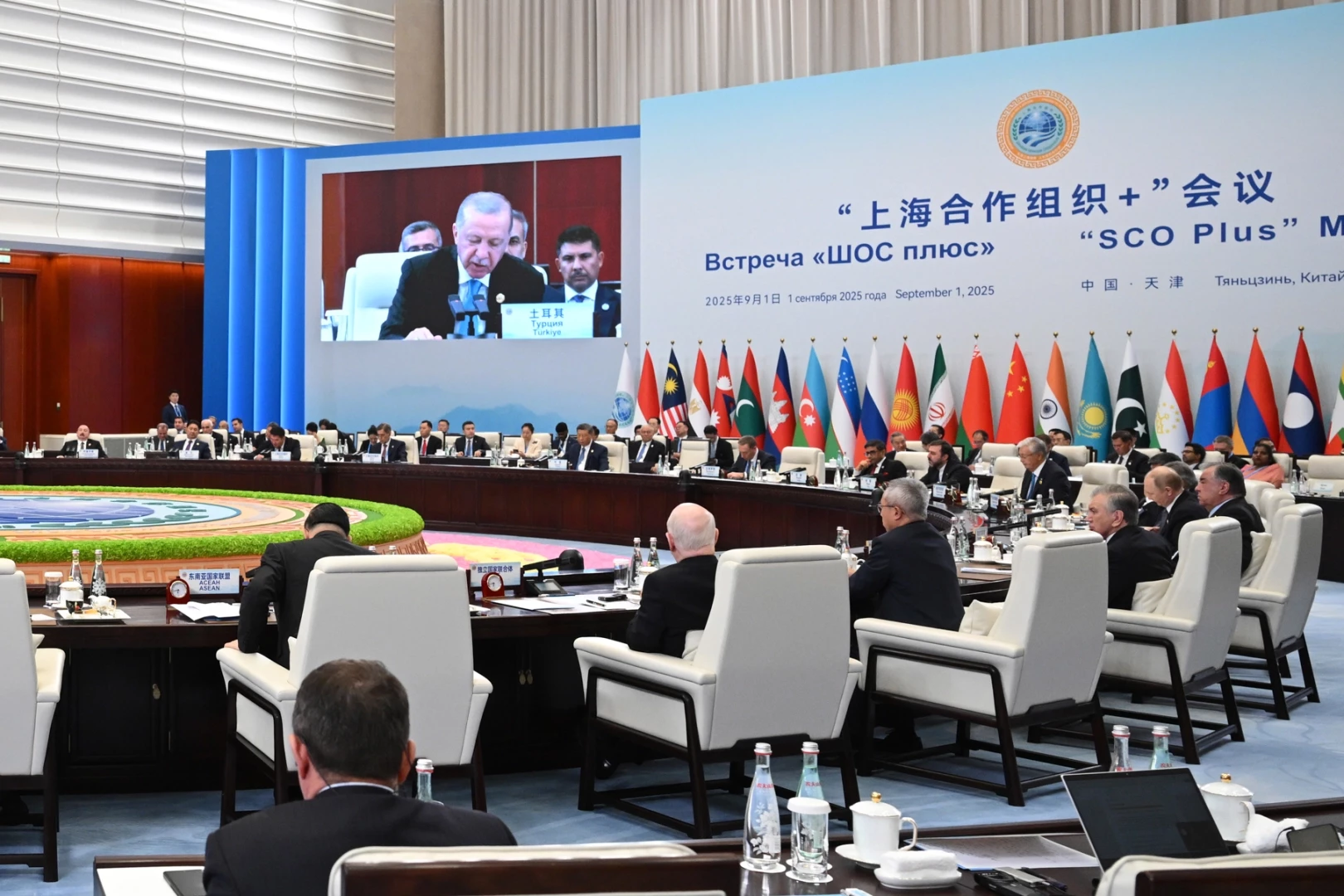 Oturumdaki konuşmasında, Yeniden Asya Girişimi çerçevesinde Asya ülkeleri ile ilişkilerini geliştirdiklerini ve bölgesel kuruluşlarla angajmanlarını artırdıklarını belirten Cumhurbaşkanı Erdoğan, "Hiç şüphesiz Şanghay İşbirliği Teşkilatı bu kuruluşlar arasında müstesna bir yere sahiptir. Küresel çapta öngörülebilirliğin azaldığı, sınamaların arttığı bir dönemde teşkilatın Şanghay ruhu ilkelerini son derece kıymetli buluyorum. Küresel sorunların çözümü ancak iş birliği ve etkin çok taraflılık temelinde müşterek gayretlerin artırılmasıyla mümkündür. Bizim açımızdan bunun vücut bulacağı nokta merkezinde Birleşmiş Milletler'in bulunduğu çok taraflı sistemdir. Ancak görüyoruz ki Birleşmiş Milletler kendine yüklenen görevleri yerine getirebilmek için ciddi bir reforma ihtiyaç duyuyor. Bundan 80 yıl önceki şartların dikte ettiği mevcut sistemin değerli dostum Sayın Guterres'in tüm gayretlere rağmen ne Orta Doğu'daki zulümleri bitirmede ne de kural temelli uluslararası düzenin idamesinde bekleneni yapabildiğini söylemek hayli güçtür." diye konuştu.