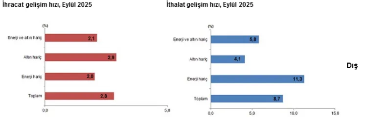 2025 yılının ilk 9 ayında ihracat, bir önceki yılın aynı dönemine göre yüzde 4,1 artarak 200 milyar 578 milyon dolar, ithalat ise yüzde 5,9 artarak 267 milyar 637 milyon dolar olarak gerçekleşti. Bu dönemde dış ticaret açığı yüzde 11,8 artışla 67 milyar 60 milyon dolar oldu.