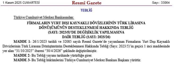 Resmi Gazete'de yayımlanan tebliğ ile yurt dışı dövizlerin TL'ye dönüştürülmesi desteği 31 Ekim 2025'ten 30 Nisan 2026'ya uzatıldı. Uygulama ile döviz girişini artırarak rezervlerin güçlendirilmesi ve TL kullanımının teşvik edilmesi hedeflendi.