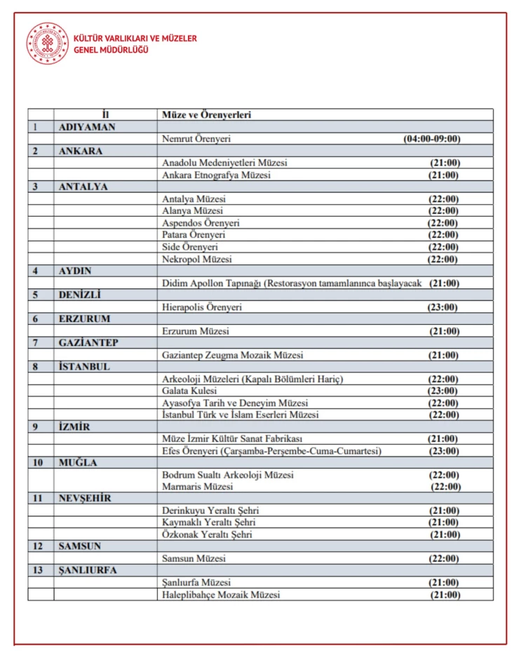 Kültür ve Turizm Bakanlığı, "Gece Müzeciliği" uygulamasıyla müze ve antik kentleri gece de ziyarete açtı. T.C. vatandaşı Müzekart sahipleri, 100 TL ek ücretle 1 Haziran-1 Ekim 2025 arasında akşam 19:00'dan itibaren bu alanları gezebilecek. İşte o müzeler ve saatleri...