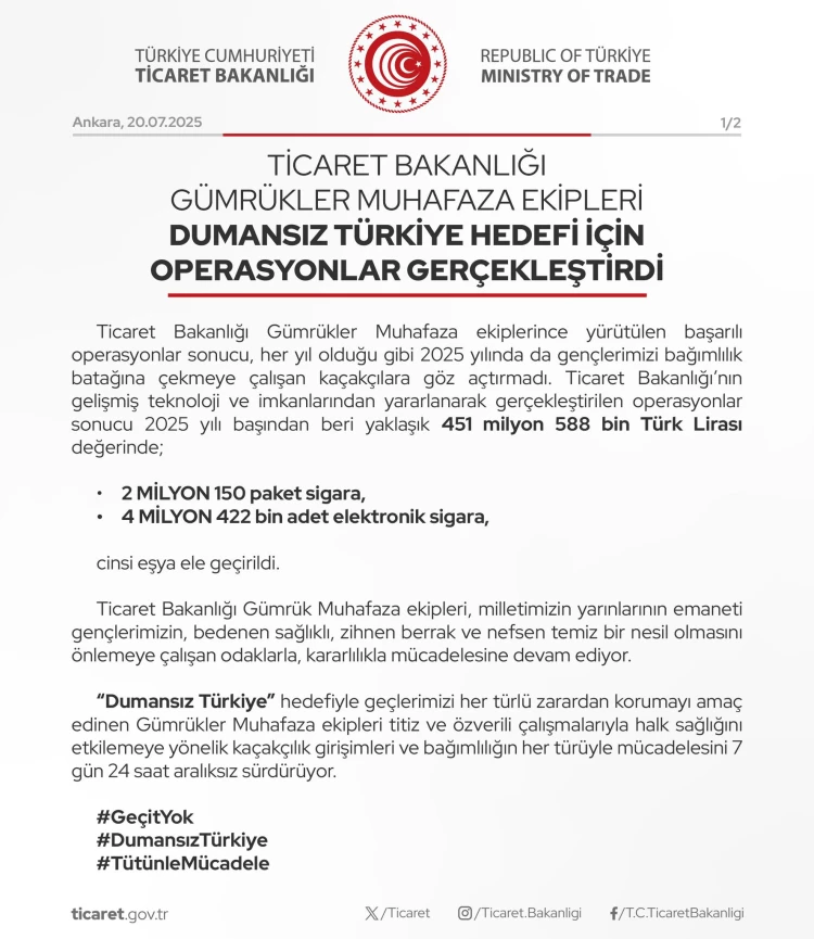 Ticaret Bakanlığı Gümrük Muhafaza ekipleri, 2025'te "Dumansız Türkiye" hedefiyle gerçekleştirdiği operasyonlarda 2 milyon 150 bin paket sigara ve 4 milyon 422 bin adet elektronik sigara yakaladı.