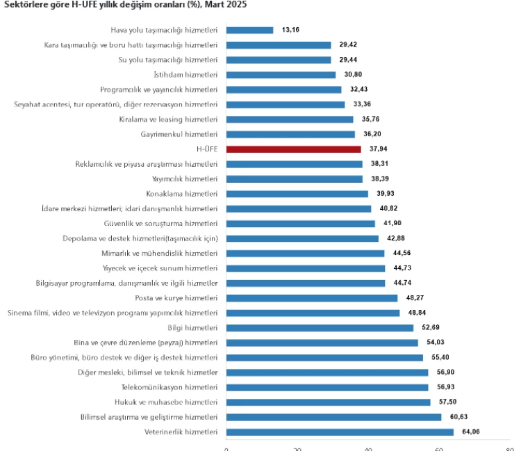 TÜİK verilerine göre, Hizmet Üretici Fiyat Endeksi (H-ÜFE) Mart 2025'te yıllık yüzde 37,94, aylık yüzde 2,25 arttı. En yüksek artış mesleki, bilimsel ve teknik hizmetlerde görülürken, yıllık bazdaki değişimde veterinerlik hizmetleri öne çıktı.