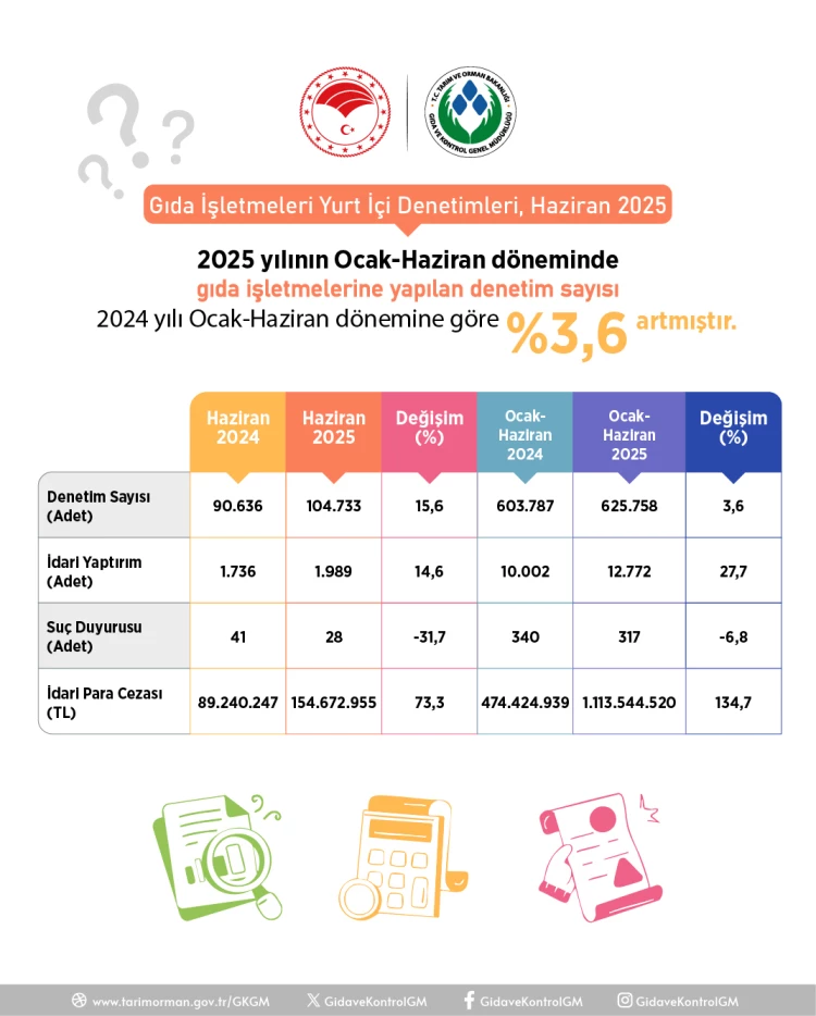 Tarım ve Orman Bakanlığı Gıda ve Kontrol Genel Müdürlüğü, Haziran 2025'te Türkiye genelinde 104.733 gıda işletmesini denetledi. 1.989 işletmeye idari yaptırım uygulanırken, toplam 154 milyon 672 bin 955 TL para cezası kesildi ve 28 işletmeci hakkında savcılığa suç duyurusunda bulunuldu.