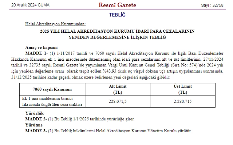 ANKARA (İGFA) - Helal Akreditasyon Kurumu'nun "2025 Yılı Helal Akreditasyon Kurumu İdari Para Cezalarının Yeniden Değerlemesine İlişkin Tebliği" bugünkü Resmi Gazete'de yayımlandı.