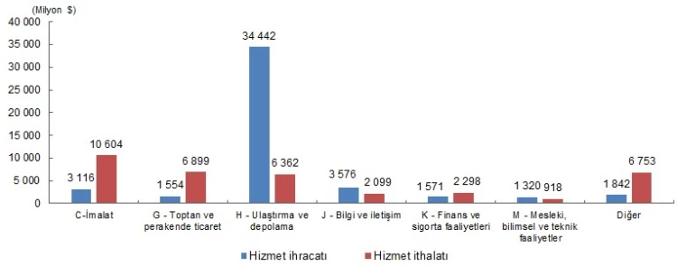 Toplamda 47 milyar 420 milyon dolar olan hizmet ihracatının 34 milyar 442 milyon dolarını ulaştırma ve depolama faaliyetindeki girişimler gerçekleştirirken, bilgi ve iletişim faaliyetindeki girişimlerin hizmet ihracatı 3 milyar 576 milyon dolar oldu. Hizmet ihracatında 3 milyar 116 milyon dolar imalat sanayiindeki girişimler tarafından yapılırken ana faaliyeti finans ve sigorta olan girişimlerin hizmet ihracatı 1 milyar 571 milyon dolar oldu.