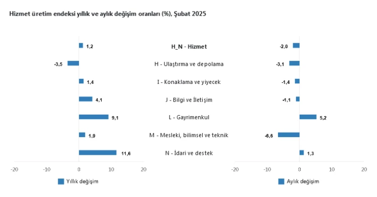 Aylık bazda ise endeks yüzde 2,0 geriledi. Ulaştırma ve depolama yüzde 3,1, konaklama ve yiyecek yüzde 1,4, bilgi ve iletişim yüzde 1,1, mesleki, bilimsel ve teknik hizmetler yüzde 6,6 azalırken; gayrimenkul hizmetleri yüzde 5,2, idari ve destek hizmetleri yüzde 1,3 artış gösterdi.
