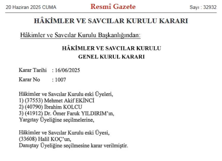 Hâkimler ve Savcılar Kurulu (HSK) Genel Kurulu'nun 16 Haziran 2025 tarihli ve 1007 sayılı kararı bugünkü Resmi Gazete'de yayımlanarak kamuoyuna duyuruldu.