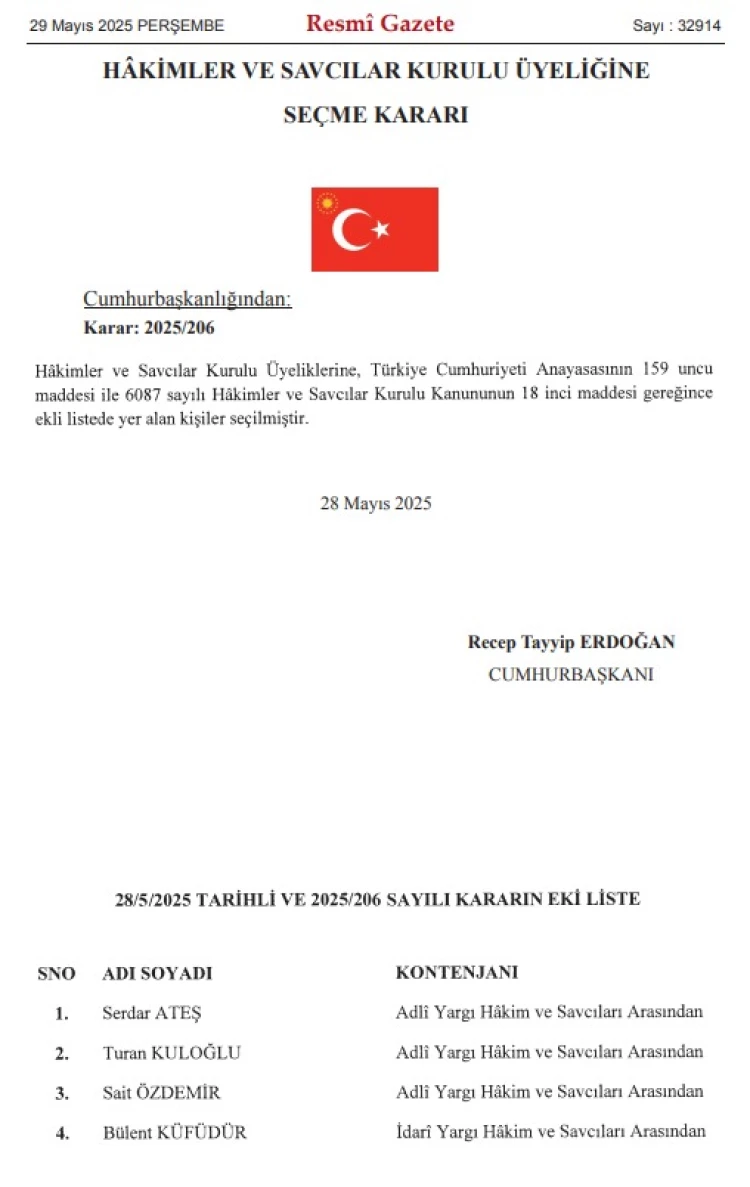 Cumhurbaşkanı Recep Tayyip Erdoğan'ın onayıyla HSK üyeliklerine seçilen ve bugünkü Resmi Gazete'de yayımlanan isimler şöyle oldu:
