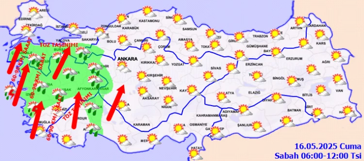 Rüzgarın; Marmara, Ege, Batı Akdeniz, İç Anadolu'nun batısında güney ve güneybatı yönlerden kuvvetli (50-70 km/sa) Kıyı Ege ile Marmara'nın batısında kuvvetli fırtına (60-90 km/sa) şeklinde eseceği beklendiğinden yaşanabilecek olumsuzluklara karşı dikkatli ve tedbirli olunmalıdır