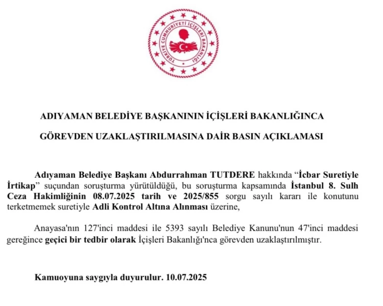 İçişleri Bakanlığı, Adıyaman Belediye Başkanı Abdurrahman Tutdere'nin konutu terk etmeme adli kontrol kararı nedeniyle geçici tedbirle görevden uzaklaştırıldığını duyurdu.