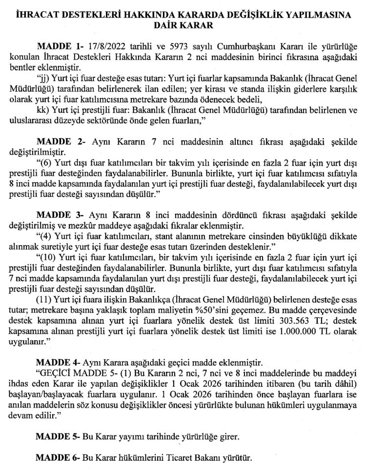 Ayrıca, 1 Ocak 2026'dan itibaren başlayacak fuarlara uygulanacak değişiklikler, fuar destek limitlerini ve koşullarını kapsıyor. Söz konusu değişiklik kararına göre bu tarihten önce başlayan fuarlara ise mevcut hükümler geçerli olacak.