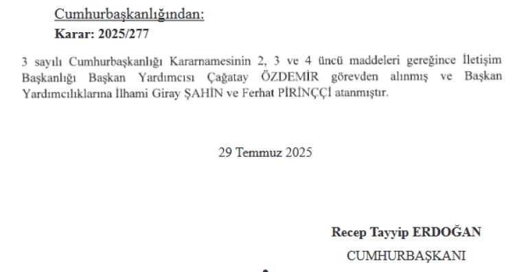 Cumhurbaşkanı Erdoğan'ın imzasıyla Resmi Gazete'de yayımlanan kararla, İletişim Başkanlığı Başkan Yardımcısı Çağatay Özdemir görevden alınırken, İlhami Giray Şahin ve Ferhat Pirinççi yeni başkan yardımcıları olarak atandı.