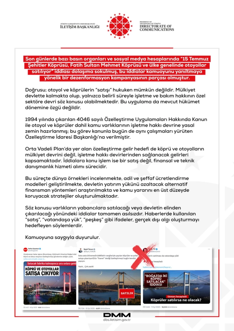 İletişim Başkanlığı, son günlerde bazı basın organları ve sosyal medya hesaplarında dolaşıma giren "15 Temmuz Şehitler Köprüsü, Fatih Sultan Mehmet Köprüsü ve otoyollar satılıyor" iddialarını yalanladı. İddiaların dezenformasyon kampanyasının parçası olduğunu belirtilerek, sadece işletme ve bakım hakkının belirli süreyle özel sektöre devrinin söz konusu olduğu açıkladı.