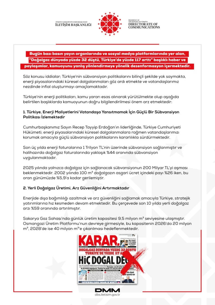 İletişim Başkanlığı, "Doğalgaz dünyada yüzde 32 düştü, Türkiye'de yüzde 117 arttı" iddialarının dezenformasyon içerdiğini belirterek, Türkiye'nin enerji sübvansiyonları ve yerli doğalgaz üretimiyle vatandaşını koruduğunu açıkladı.