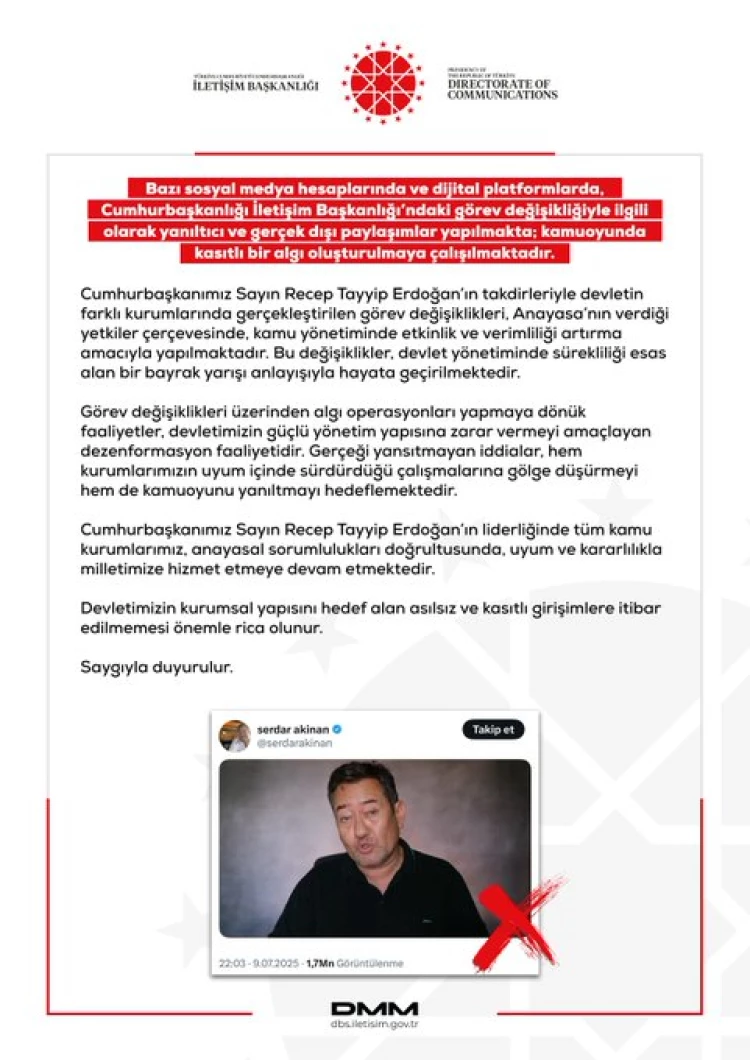 İletişim Başkanlığı Dezenformasyonla Mücadele Merkezi, Cumhurbaşkanlığı'ndaki görev değişiklikleriyle ilgili yanıltıcı paylaşımlara karşı uyarıda bulunarak, bu durumun kamu yönetimini hedef alan bir algı operasyonu olduğunu belirtti.