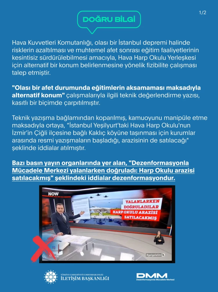 İletişim Başkanlığı Dezenformasyonla Mücadele Merkezi'nden yapılan yazılı açıkalmada, "Hava Kuvvetleri Komutanlığı, olası bir İstanbul depremi sonrası eğitim faaliyetlerinin kesintisiz sürmesi için Hava Harp Okulu Yerleşkesi'ne alternatif konum fizibilite çalışması talep etmiştir. Teknik yazışma, bağlamından koparılarak "Hava Harp Okulu'nun İzmir'e taşınacağı ve arazinin satılacağı" şeklinde çarpıtılmıştır. Merkezimiz, iddiaları yalanlamış ve Hava Harp Okulu'nun taşınmasına yönelik bir karar olmadığını vurgulamıştır. Yerleşkede deprem riskine karşı güçlendirme ve kapasite artırım çalışmaları devam etmektedir. Kamuoyunu yanıltıcı dezenformasyon kampanyalarına itibar edilmemelidir" ifadeleri yer aldı.