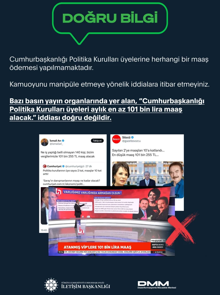 İletişim Başkanlığı Dezenformasyonla Mücadele Merkezi tarafından yapılan açıklamada Politika Kurulları üyelerine herhangi bir maaş ödemesi yapılmadığını belirterek, kamuoyunu yanıltıcı ve manipülatif iddialara itibar edilmemesi gerektiğinin altı çizildi.