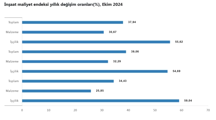 İnşaat maliyet endeksi, 2024 yılı Ekim ayında bir önceki aya göre yüzde 1,48 arttı, bir önceki yılın aynı ayına göre yüzde 37,94 arttı. Bir önceki aya göre malzeme endeksi yüzde 1,73 arttı, işçilik endeksi yüzde 0,98 arttı. Ayrıca bir önceki yılın aynı ayına göre malzeme endeksi yüzde 30,67 arttı, işçilik endeksi yüzde 55,62 arttı.