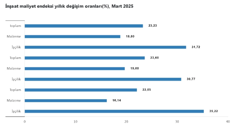 İnşaat maliyet endeksi Mart 2025'te yıllık yüzde 23,23, aylık yüzde 1,53 artış gösterdi. İşçilik maliyetleri ise yıllık yüzde 31,72 yükseldi.