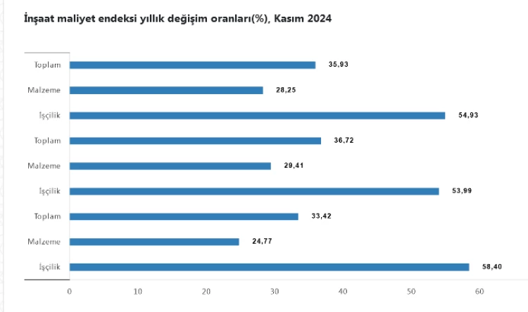 İnşaat maliyet endeksi, 2024 yılı Kasım ayında bir önceki aya göre yüzde 0,04 artarken, bir önceki yılın aynı ayına göre yüzde 35,93 arttı.