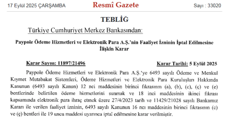 Bugünkü Resmi Gazete'de yayımlanarak yürürlüğe giren kararlara göre, IQ Money için 10 Eylül 2020 tarihli ve 10953/20552 sayılı izin, Paypole için ise 27 Nisan 2023 tarihli ve 11429/21028 sayılı izin iptal edildi. Söz konusu şirketler, artık Türkiye'de ödeme hizmeti sunamayacak ve elektronik para ihraç edemeyecek.