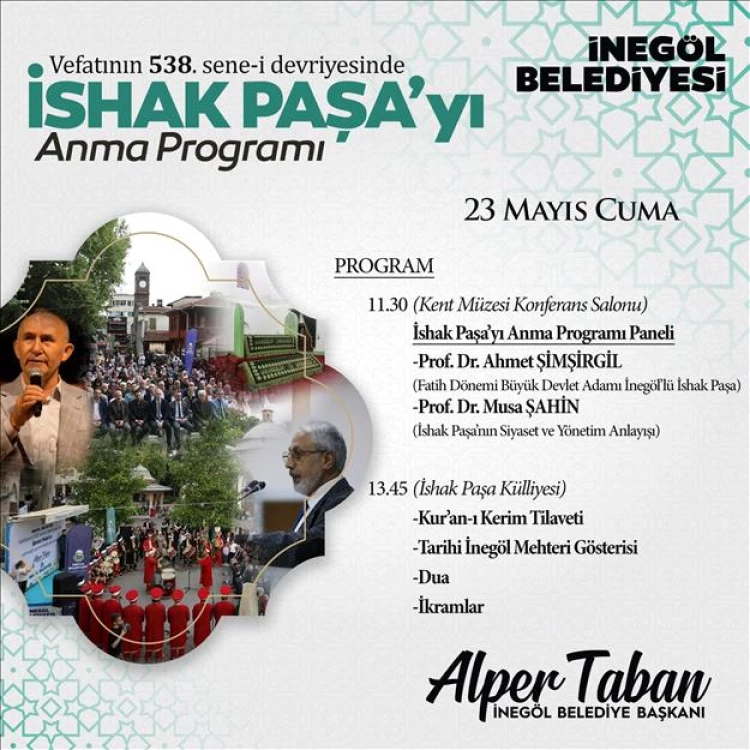 Son 2 yıldır düzenlenen ve artık geleneksel hale getirilerek İnegöl Belediyesi'nin organizasyonuyla bu yıl 3'üncüsü gerçekleştirilecek olan döneminin önemli devlet adamlarından İshak Paşa'nın vefatının 538. yılında anılacağı program için İnegöl Belediye Başkanı Alper Taban davet mesajı yayınladı. Başkan Alper Taban, "İnegöl'ümüzün yetiştirdiği, Osmanlı Devleti döneminin önemli devlet adamlarından, iki padişah döneminde Veziriazamlık yapmış İshak Paşa'yı anma programımızı geleneksel hale getirdik. Bu yıl da 23 Mayıs Cuma günü saat iki özel programla anma programını gerçekleştireceğiz. 11.30'da İnegöl Kent Müzemizin konferans salonunda Prof. Dr. Ahmet Şimşirgil ile Prof. Dr. Musa Şahin'in konuşmacı olarak katılacağı panel ve akabinde Cuma namazı sonrası 13.45'te İshak Paşa Külliyesinde; Kuran-ı Kerim Tilavetleri, Tarihi İnegöl Mehteri gösterileri, dualar ve ikramlarla bir program icra edilecek. Her iki programa da tüm ilçe halkımızı davet ediyoruz" dedi.