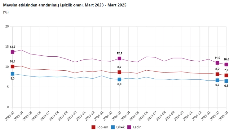 Hanehalkı İşgücü Araştırması sonuçlarına göre; 15 ve daha yukarı yaştaki kişilerde işsiz sayısı 2025 yılı Mart ayında bir önceki aya göre 65 bin kişi azalarak 2 milyon 807 bin kişi oldu. İşsizlik oranı ise 0,3 puan azalarak yüzde 7,9 seviyesinde gerçekleşti. İşsizlik oranı erkeklerde yüzde 6,5 iken kadınlarda yüzde 10,6 olarak tahmin edildi.
