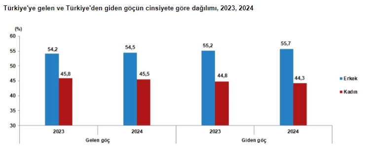 Türkiye'ye 2024'te gelen göçmen sayısı yüzde 0,6 azalarak 314 bin 588 olurken, yurt dışına göç edenlerin sayısı yüzde 40,6 düşüşle 424 bin 345'e geriledi. En fazla göç 20-24 ve 25-29 yaş gruplarında gerçekleşti, İstanbul göç hareketliliğinde başı çekti.