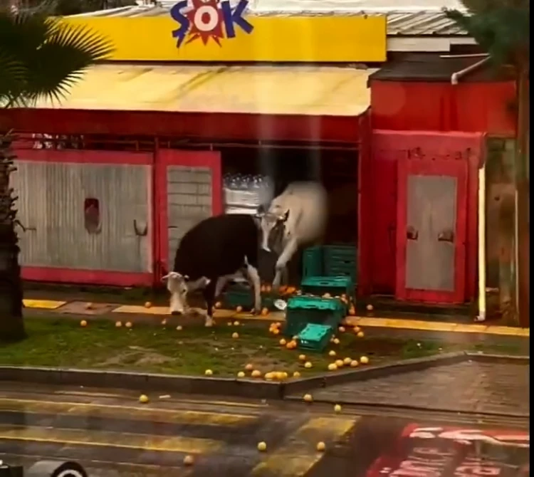Çok sayıda beğeni ve yorum alan görüntülerde, markete giren iki ineğin marulları yediği, bu sırada temizlik yapan bir personelin elindeki paspasla hayvanları uzaklaştırdığı ve girişteki meyve sebze kasalarının devrilme görüntüleri şaşkınlık içinde izlendi.