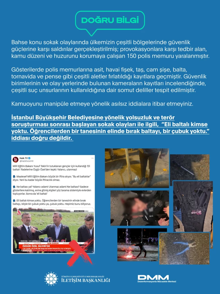 İletişim Başkanlığı, İstanbul Büyükşehir Belediyesi'ne yönelik yolsuzluk ve terör soruşturmasının ardından başlayan sokak olaylarıyla ilgili yayılan "Eli baltalı kimse yoktu. Öğrencilerden bir tanesinin elinde bırak baltayı, bir çubuk yoktu" iddiasının gerçeği yansıtmadığını açıkladı.