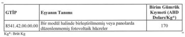 Buna göre, özellikle fotovoltaik (solar) modül ve paneller ile fotovoltaik hücreler (GTİP 8541.42.00.00.00 ve 85.41) gibi ürünlerin ithalatına yönelik gözetim uygulamalarının usul ve esasları yeniden düzenlendi. Değişiklik, yayımı takip eden 60'ıncı gün yürürlüğe gireceği kaydedildi.
