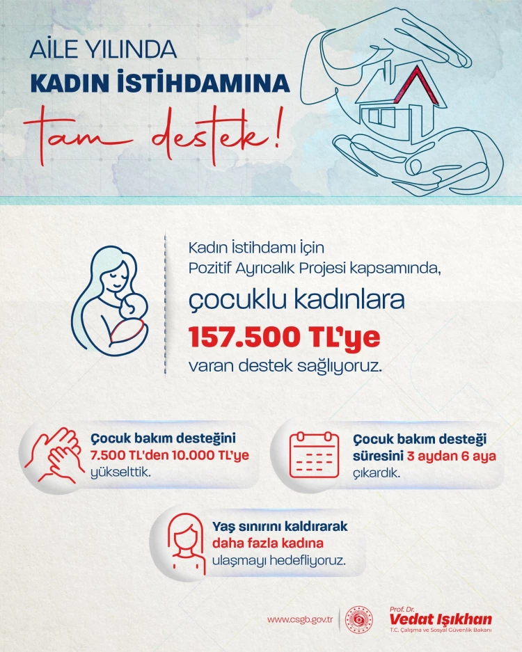 Çalışma ve Sosyal Güvenlik Bakanı Vedat Işıkhan, Kadın İstihdamı İçin Pozitif Ayrıcalık Projesi kapsamında çocuklu kadınlara 157 bin 500 TL'ye kadar destek sağlanacağını duyurdu. Çocuk bakım desteği 7 bin 500 TL'den 10 bin TL'ye, süre ise 3 aydan 6 aya uzatıldı ve yaş sınırı kaldırıldı.