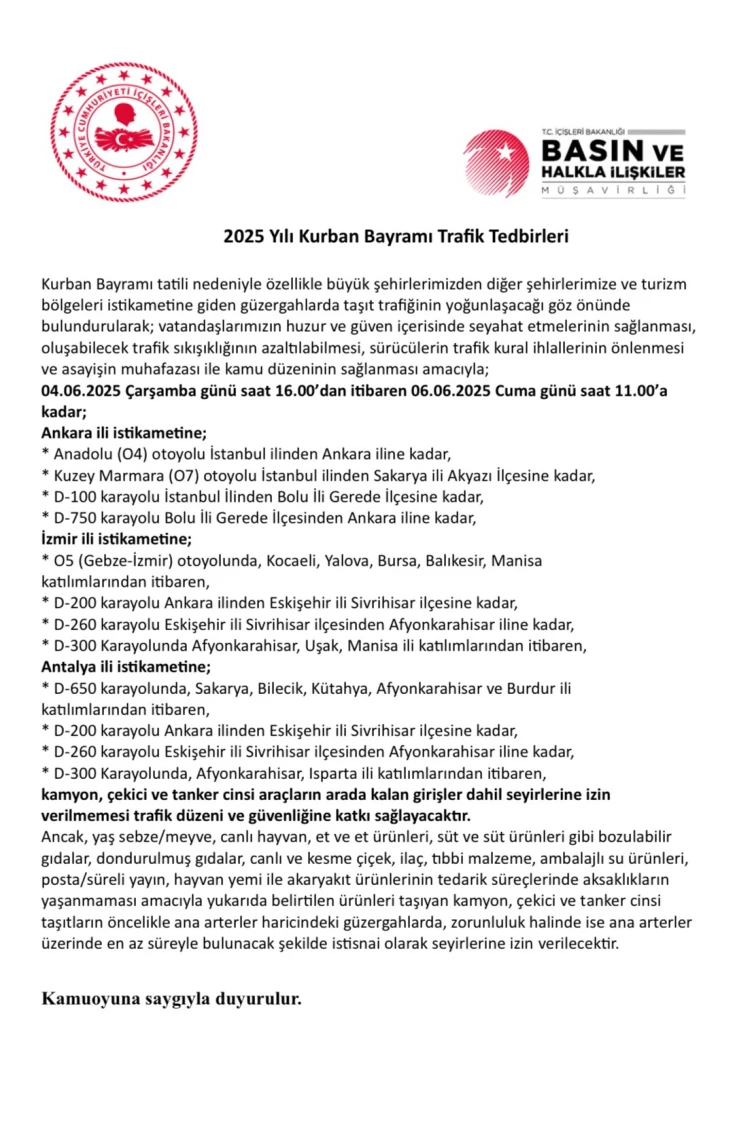 ANKARA (İGFA) - İçişleri Bakanlığı, Kurban Bayramı tatili nedeniyle artan trafik yoğunluğunu azaltmak ve vatandaşların güvenli seyahat etmesini sağlamak amacıyla 4 Haziran 2025 Çarşamba saat 16.00'dan 06 Haziran 2025 Cuma saat 11.00'e kadar bazı güzergâhlarda kamyon, çekici ve tanker tipi araçların seyirlerine kısıtlama getirildiğini duyurdu.