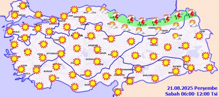 Meteoroloji Genel Müdürlüğü'nün 21 Ağustos tarihli değerlendirmelerine göre, Türkiye'nin kuzeydoğu kesimlerinde parçalı ve yer yer çok bulutlu bir hava bekleniyor.